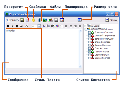Управляйте организацией эффективнее и посылайте мгновенные сообщения вместо Email почты. Послать сообщение или файл через мгновенное сообщение быстрее и эффективнее чем через Email. К тому же вы будете видеть есть ли на месте ваш собеседник.