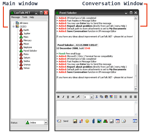 В отличие от бесплатных мессенджеров, таких как Майл.Ру Агент, AOL Messenger, ICQ, Windows или MSN Messenger которые используют интернет и свои сервера, чтобы передать сообщение даже в соседнюю комнату, LanTalk NET передаёт сообщение напрямую по вашей локальной сети. Нашему мессенджеру не нужен интернет и ваши сообщения не будут проходить через чужие сервера, где к ним может получить доступ кто угодно.